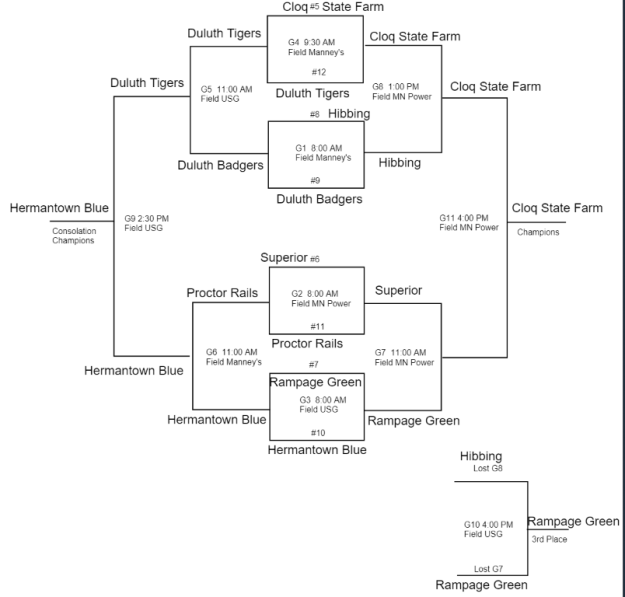 Katie Metzer (Cloquet Park Avenue Fitness), Lorelyn Nelson (Duluth TIgers), Jenna Sacco-Lamusga (Hibbing), Ella Maslowski (Cloquet State Farm), Lilly Crouley (Hermantown Blue), Jill Anderson (MN Blast 12s), Madison Wasche (Moose Lake Hoffman Hardware), Lauren Johnson (Proctor Rockets), Eva Peterson (Superior), Kendyle Suksi (Proctor Rails), Abby Mitchell (Rampage Green), Abby Grafmyre (Duluth Badgers)