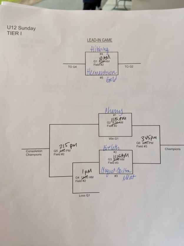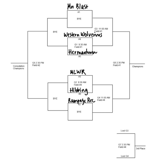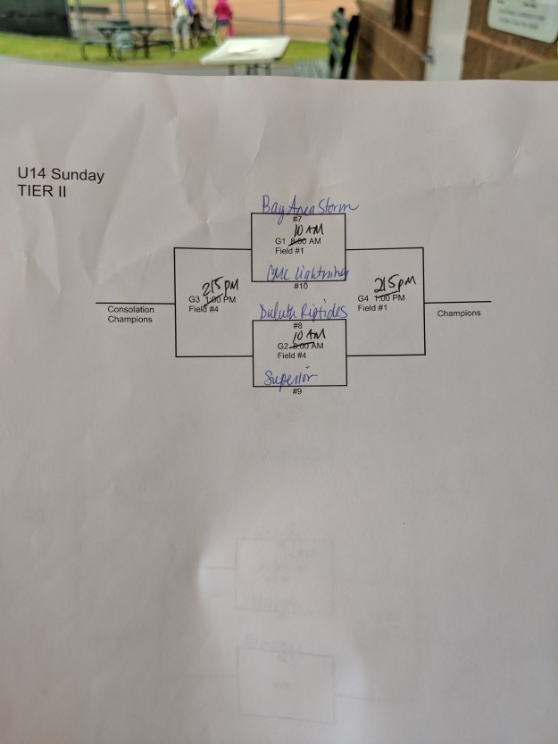 Updated brackets are below, but games are about 30 minute behind schedule due to lightning.